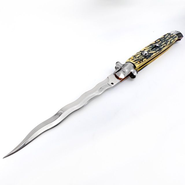 11" Big Boss Faux Stag Milano Stiletto Automatic Switch Blade Kriss Knife. If you need a knife that’ll send a message, this Big Boss Faux Stag Milano Stiletto is the knife for you! You’ll leave your attacker quaking in their boots when you pull out this bad boy, that’s for sure. This menacing automatic stiletto knife features a near 6-inch stainless-steel blade with a mirror polish finish, as well as an impressive faux stag handle. To open the knife, you will press the shiny silver button at the top of the handle. To close, push the silver t-shaped bolster above the handle toward the base with your thumb. A slide lock on the handle prevents accidental opening while not in use. Included with this knife is a free black nylon quick release sheath with belt loop for easy carry. Overall Length: 12.50 Inches, Blade Length: 5.62 Inches