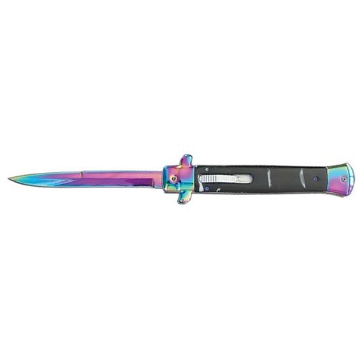 11" Old School Classic Black Marble Stiletto D/A OTF Auto Knife Titanium (4.75" Bayonet). This classic style, stiletto blade knife features an old world feel that is reminiscent of the widely popular and very recognizable godfather stiletto automatic knives. But this version has an out the front blade that smoothly flies out the front of the handle with a flick of the switch. Blade: 4.75" Overall: 11" Closed: 6.125" Weight: 8.4 oz.