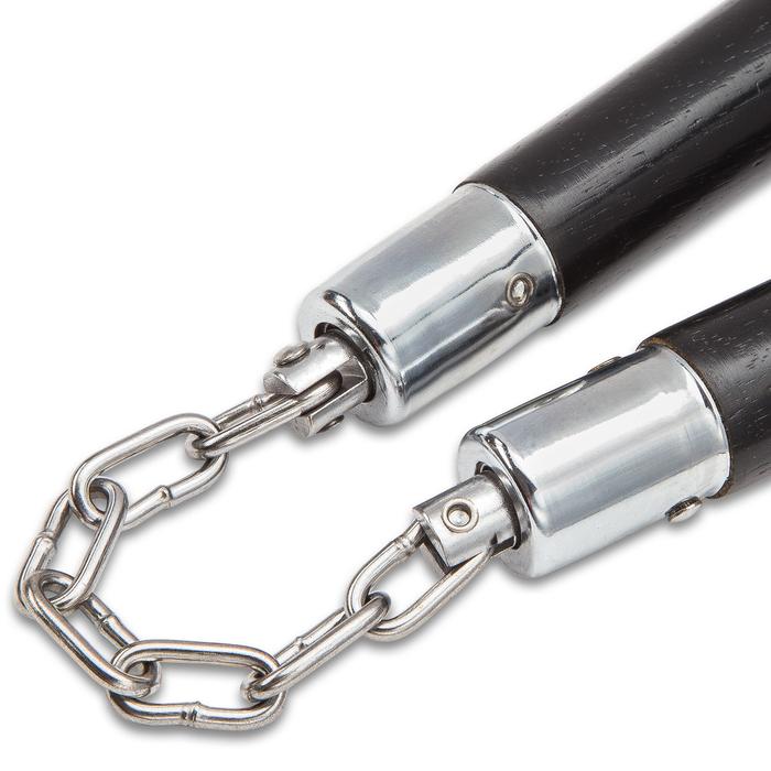 12" Black Wood Nunchaku Red Stripes. Add a high-quality pair of Nunchaku to your martial arts school or just for yourself. Made of a sturdy black round hardwood, these will last for years to come even with abuse. They have a ball bearing chain and are 12” in overall length. High-quality is what you want when you're looking for martial arts tools. Look no further!
