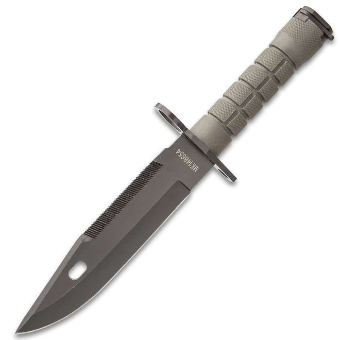 12" Survival Knife Army Green Black M-9 Bayonet. This bayonet knife makes a great companion to your firearm, especially in the heat of battle when anything can happen It has a 7” stainless steel blade with a non-reflective finish and heavy serrations on the spine, extending from a muzzle ring guard The textured and deep-grooved, black TPU handle has a bayonet clip on the pommel that fits any standard bayonet lug The 12” overall bayonet knife slides securely into a sturdy nylon belt sheath, which features multiple attachment options