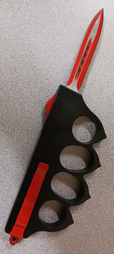 1918 US Black D/A OTF Trench Automatic Knuckle Knife Red Two Tone Dagger. Overall Length: 9 Inches Blade Length: 3.5 Inches Blade Material: 440 Stainless Steel, Powder coated black finish Blade Style: Dagger Handle Length: 6 Inches Handle Material: Cast metal, Heavy duty construction Includes: Pocket Clip, Glass breaker, belt sheath.