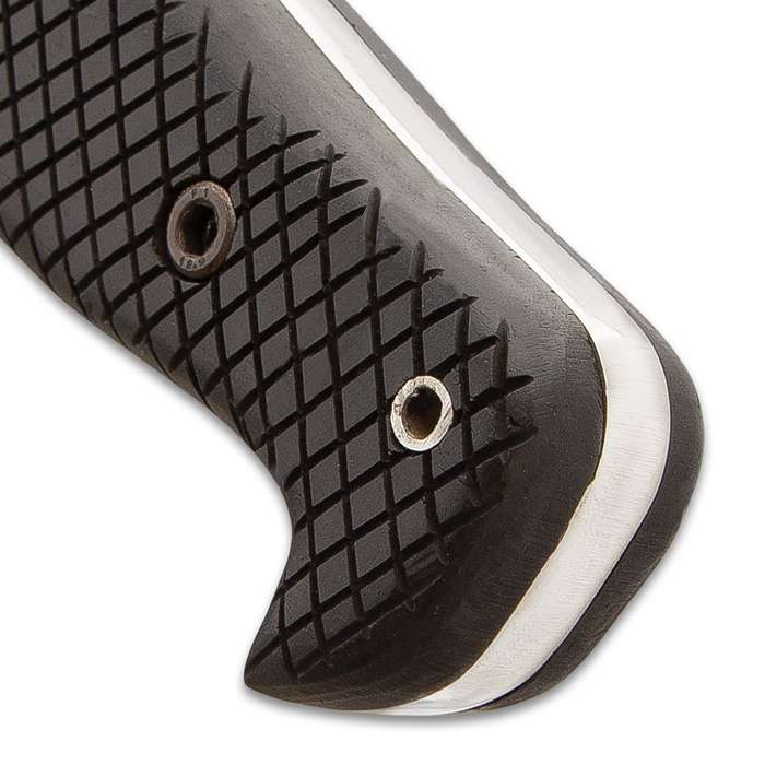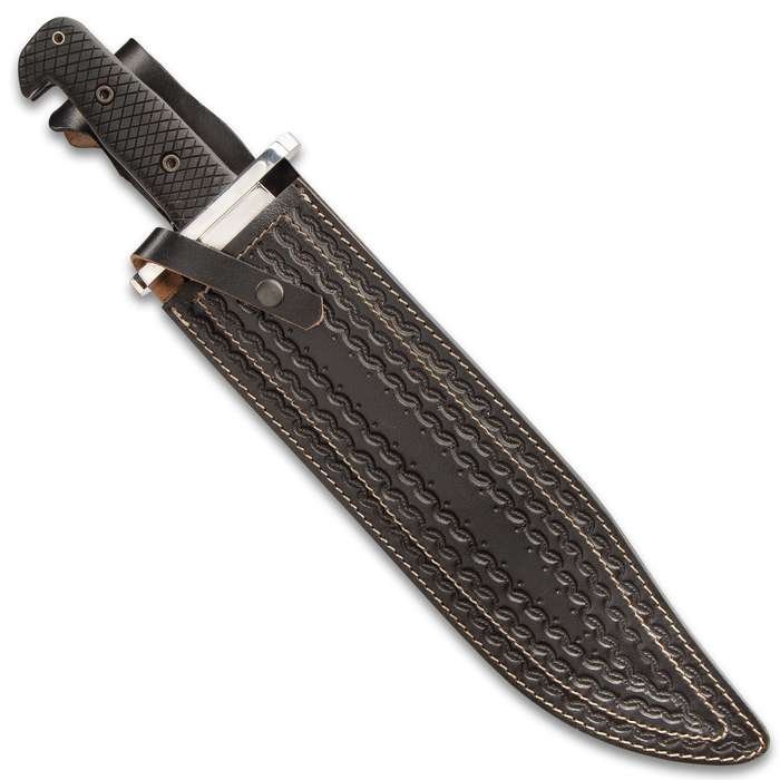 This knife is unbelievable! It’s not just huge because that would be an understatement, it’s the absolute Godzilla of knives! The massive stainless steel blade is a whopping 3” wide, 1/4” thick and has a razor-sharp 14” edge with a clip point The crosshatched TPR and stainless steel handle is secured with heavy-duty screws and it features a lanyard hole A hefty stainless steel handguard effectively keeps your hand from slipping to the massive blade The gargantuan 20” overall fixed blade knife is housed in an intricately decorated, premium genuine leather belt sheath