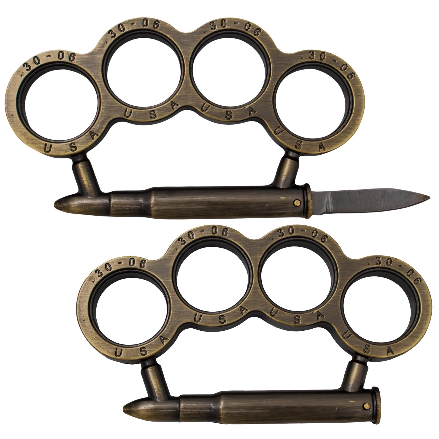 30-06 Bullet Knuckles Antique Brass Folding Knife Paperweight. Solid metal construction - Weighs almost 3 ounces 4.5 inch length - 2.5 inch width Almost half an inch thick! ".30-06 / USA" etch into each finger hole Knuckle palm rest is in shape of miniature .30-06 bullet. The blade is 440 stainless steel and measures out to 1.25 inches