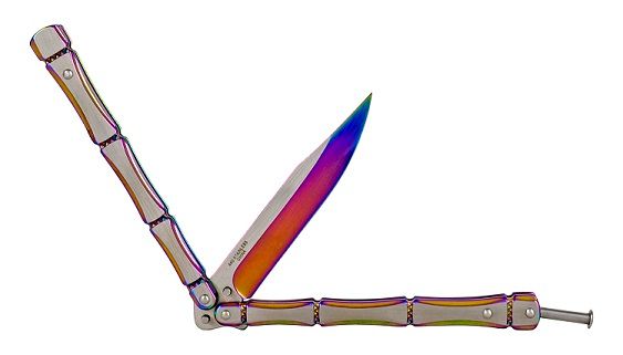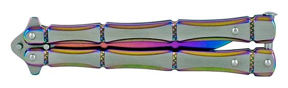 5" Titanium Bones Heavy Butterfly Knife Clip Point Balisong. Blade Material 440 Stainless Steel Blade Type Clip Point Folding Action Butterfly Handle Construction Stainless Steel Features Safety Clip Blade Length 4" Handle Length 5" Overall Length 9"