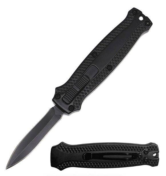 5.25" Mini Black Automatic OTF Out The Front Knife. The Mini Black Automatic OTF Knife is quick and tactical with its double action trigger and OTF design. The knife has a razor-sharp, 440 stainless steel dagger blade black finish. The 3.25” handle is black CNC-milled, anodized aluminum, and the trigger switch is conveniently located on top. The 5.25” overall OTF knife also features a key-chain loop for a carrying option. The Mini Automatic OTF Knife is quick and tactical with its double action trigger and OTF design It has a razor-sharp 440 stainless steel blade black finish The 3.25” handle is CNC-milled, anodized aluminum, and the trigger switch is conveniently located on top The 5.25” overall OTF knife also features a key-chain loop for a carrying option