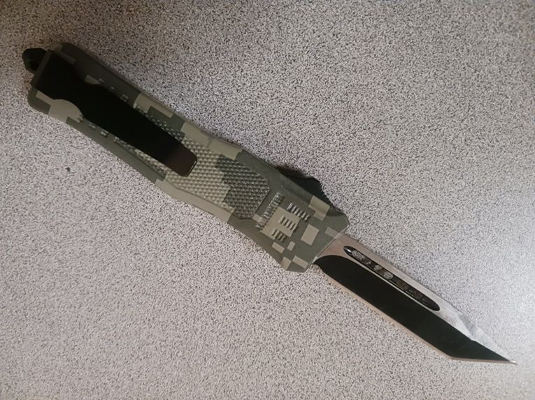 6.5" Delta Force Digital Camo D/A OTF Automatic Knife Tanto Point Two Tone Plain. 6.5 inches total length 2.5" 440 stainless steel blade. comes with pocket clip, glass breaker and a belt sheath. This is old stock we found laying around. Very limited stock.
