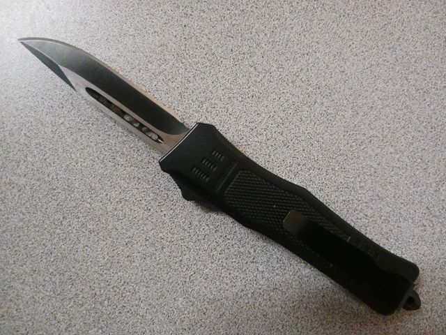 7.75" Delta Force D/A OTF Black Automatic Knife Two Tone Drop Point. 7.75 inches total length 3.25 inch 440 stainless steel blade. comes with pocket clip, glass breaker and a belt sheath. Taiwan made with super spring action!