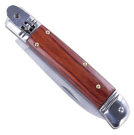 8" Classic Wood Leverlock Automatic Knife Flat Grind Drop Point. Specifications Overall Length: 8 Inches Blade Length: 3.50 Inches Blade Width: 0.75 Inch Blade Thickness: 2.63 mm Handle Length: 4.59 Inches Blade Style: Spey Point Blade Construction: Stainless Steel Handle Construction: Wood Includes: Black Nylon Sheath Features: Wood Grips, Lever Lock, Automatic Knife