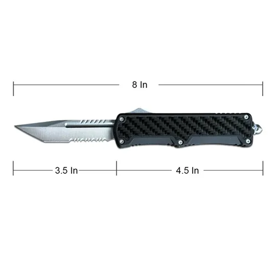 8" Compact Satin Finish Tanto Serrated Blade Carbon Fiber Automatic D/A OTF Knife. This Carbon Fiber OTF knife features a satin finish 440 stainless steel tanto point style partially serrated blade. The dual action allows you to use a slider trigger located on the side of the handle to propel the blade forward as well as retract. Talk about easy access! The handle itself is made from durable zinc alloy and carbon fiber insert for a firm hold even in the toughest weather conditions. A steel pocket clip and handy emergency glass breaker are featured on the handle. Overall Length 8 inches with Handle Length of 4.5 inches. Specifications Overall Length: 8 inch Handle Length: 4.5 inch Blade Length: 3.5 inch Features Automatic Out the Front 440 Stainless Steel Blade Satin Finish Blade Zinc Alloy Handle with Carbon Fiber Insert Pocket Clip & Glass Breaker