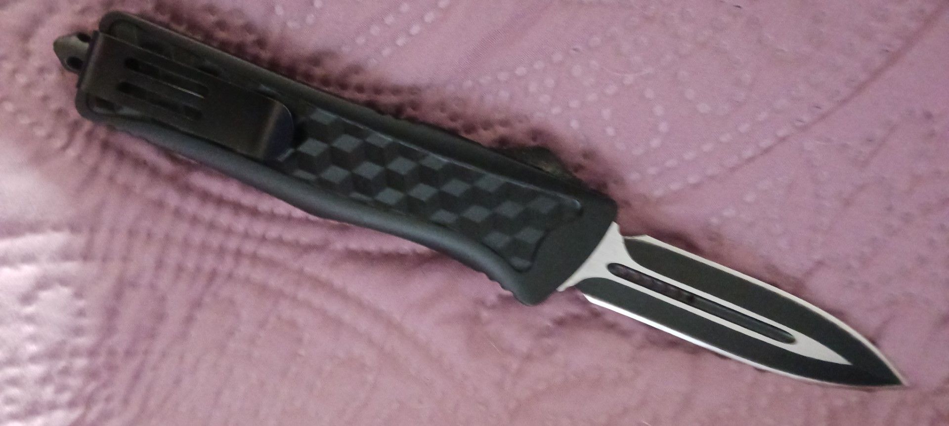 9" American Mercenary Tactical D/A OTF Automatic Knife Two Tone Dagger. This American Mercenary OTF knife features a two tone black and satin finish stainless steel dagger style blade. The dual action allows you to use a slider trigger located on the side of the handle to propel the blade forward as well as retract. A steel pocket clip and handy emergency glass breaker are featured on the handle. Overall Length 9 inches with Handle Length of 5.5 inches. Includes FREE Nylon Pouch with Belt Loop.