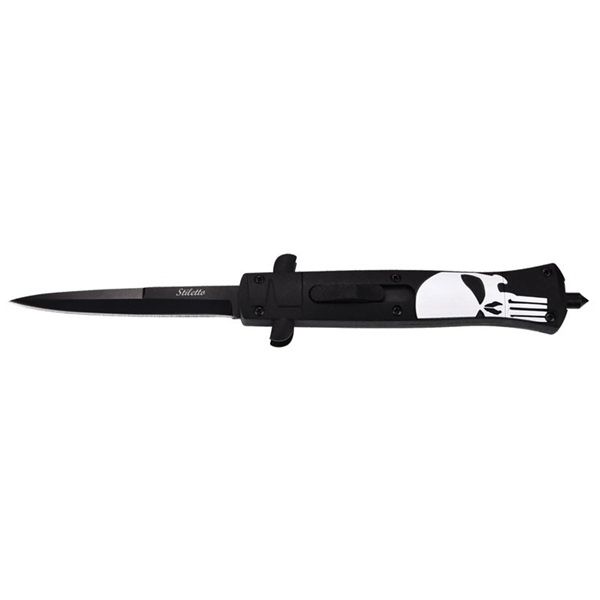 9" Punisher Skull ABS Black D/A OTF Stiletto Automatic Knife Black Bayonet. This 9" Italian Style OTF model features a spear point blade. Get the best of both worlds with the Stiletto OTF automatic. This knife brilliantly combines the classic style of an Italian stiletto and the tactical speed of an OTF. A front loaded thumb slide fires and retracts the blade with smooth automatic precision. A steel pocket clip and handy emergency glass breaker are featured on the handle. Overall Length 9 inches with Handle Length of 5.5 inches. Features: 9" open length 5.5" closed length Nylon Fiber Handle 3.5" Stainless Steel Blade Glass Breaker Stub Pocket Clip