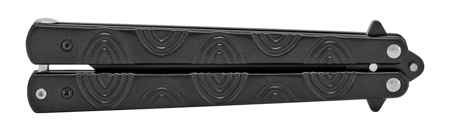 9" Skipping Waves Black Heavy Butterfly Knife Black Drop Point. Blade Material 440 Stainless Steel Blade Type Practice Folding Action Butterfly Handle Construction Stainless Steel Features Safety Lock Blade Length 4.13" Handle Length 5.25" Overall Length 9.38"