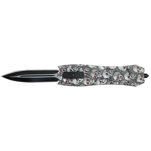 9" Skulls of Death Gray D/A OTF Automatic Knife Dagger Point Two Tone Plain. This knife is bad ass with a substantial size. The handle is constructed from zinc alloy with a molded skeletal design. The end of the handle comes with a punch for any emergency situations that may arise. A slider is provided for deployment and retraction of this dual action blade. The movement is smooth and flawless. The stainless steel blade comes with a two-tone finish. This massive knife comes with a steel pocket clip to transport your blade. Specifications Overall Length: 9 Inches Blade Material: Stainless Steel, Two Tone Handle Length: 5.5 Inches Handle Material: Zinc alloy with a molded skeletal design Features 3.5" Spear Point Blade Stainless Steel Blade Glass Breaker Pocket Clip