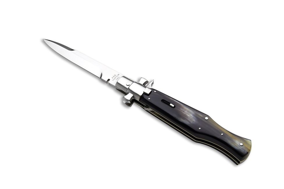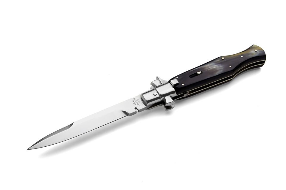 A.G.A Campolin Black Widow Brazilian Cow Horn Full Handle Italian Stiletto Automatic Knife. This is the fantastic " Black Widow " from the great knifemakers A.G.A Campolin in Maniago, Italy. This handmade automatic stiletto with a maltese crossguard has a square button/safety and comes with lever release mechanism. All components are made from nickel silver and it has a 5mm spring and 1.2mm liners. The round bayonet blade is made of 440C stainless steel and has a mirror polish finish. The handle on this switchblade is a wasp body of brazilian cow horn(note: colour, as natural materia, can be light or dark). The quality and craftsmenship is excellent on this knife. It comes with a A.G.A Campolin certificate. Overall Length: 28cm - 11" Blade Length: 12.5cm - 5" Blade thickness: 5mm - 0.2" Weight: 280gr - 9.9oz Blade Material: 440C Stainless Steel Handle Material: Brazilian Cow Horn Made in: Italy