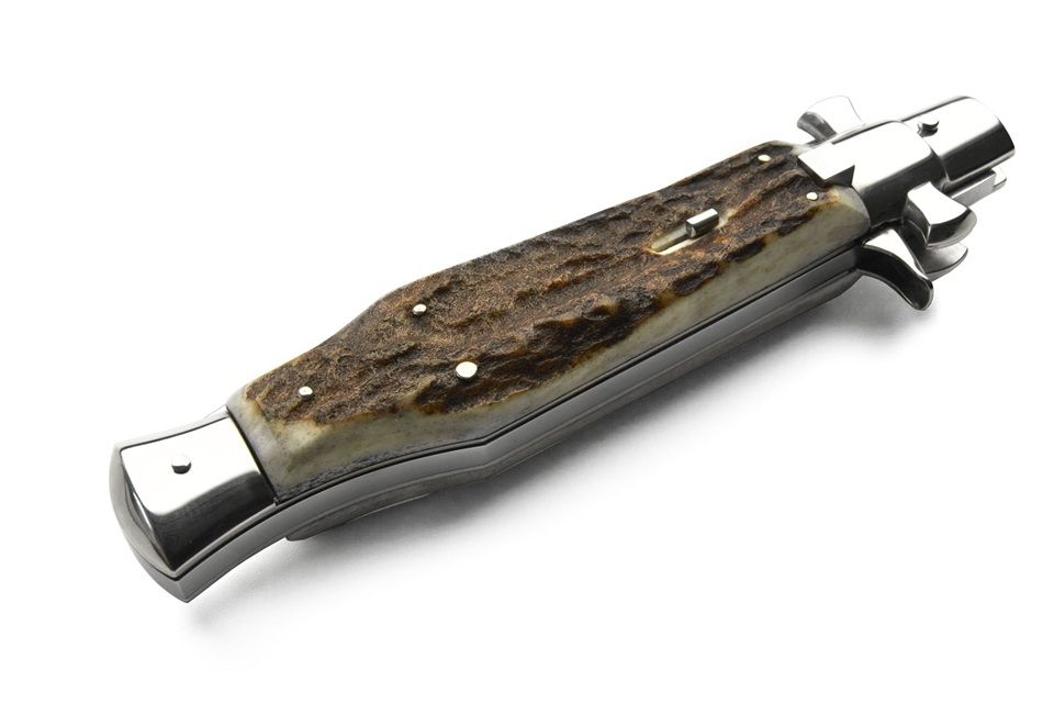 A.G.A. Campolin Black Widow Stag Horn Italian Stiletto Automatic Knife. This is the fantastic " Black Widow " from the great knifemakers A.G.A Campolin in Maniago, Italy. This handmade automatic stiletto with a maltese crossguard has a square button/safety and comes with lever release mechanism. All components are made from nickel silver and it has a 5mm spring and 1.2mm liners. The round bayonet blade is made of 440C stainless steel and has a mirror polish finish. The handle on this switchblade is a wasp body of stag horn. The quality and craftsmenship is excellent on this knife. It comes with a A.G.A Campolin leather pouch and certificate. Note: as it is a natural material, color, texture and pattern will vary from knife to knife. Overall Length: 28cm - 11" Blade Length: 12.5cm - 5" Blade thickness: 5mm - 0.2" Weight: 280gr - 9.9oz Blade Material: 440C Stainless Steel Handle Material: Stag Horn Made in: Italy