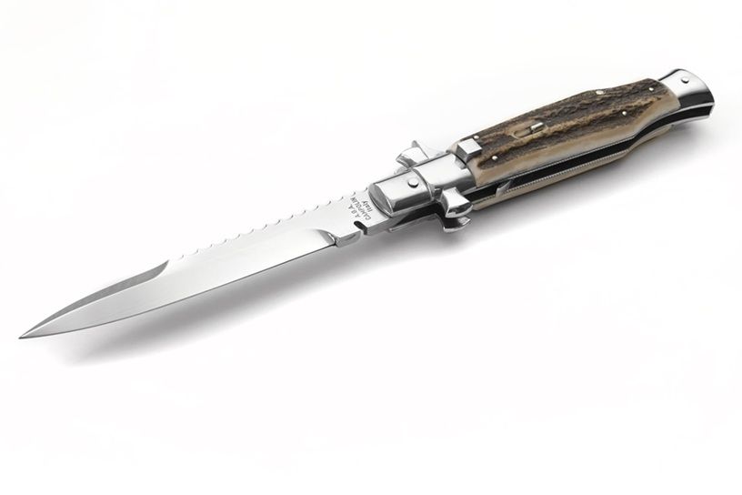 A.G.A. Campolin Black Widow Stag Horn File Work Bolster Italian Stiletto Automatic Knife. This is the fantastic " Black Widow " from the great knifemakers A.G.A Campolin in Maniago, Italy. This handmade automatic stiletto with a maltese crossguard has a square button/safety and comes with lever release mechanism. All components are made from nickel silver and the blade, spring and liners are filed work as used in the old tradition of switchblade production. The round bayonet blade is made of 440C stainless steel and has a mirror polish finish. The handle on this switchblade is a wasp body of stag horn. The quality and craftsmenship is excellent on this knife. It comes with a A.G.A Campolin certificate. Note: as it is a natural material, color, texture and pattern will vary from knife to knife. Overall Length: 28cm - 11" Blade Length: 12.5cm - 5" Blade thickness: 5mm - 0.2" Weight: 280gr - 9.9oz Blade Material: 440C Stainless Steel Handle Material: Stag Horn Made in: Italy