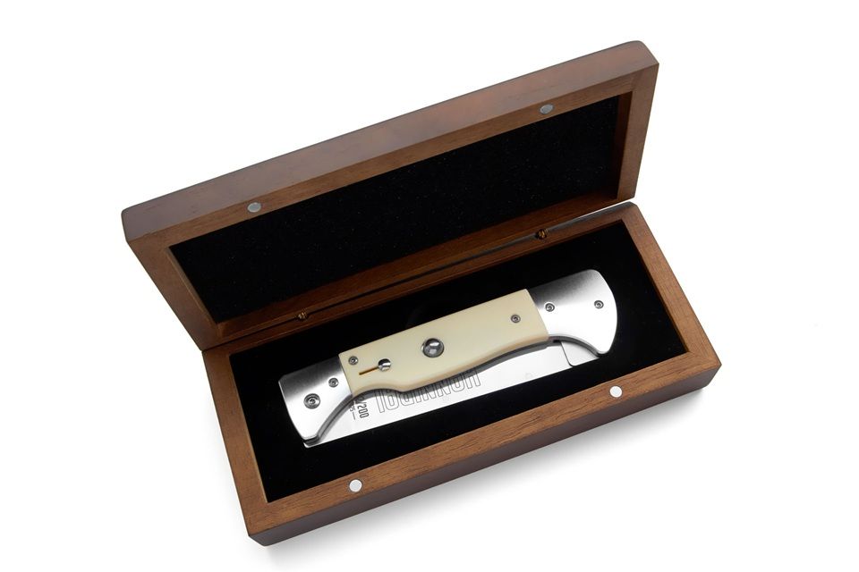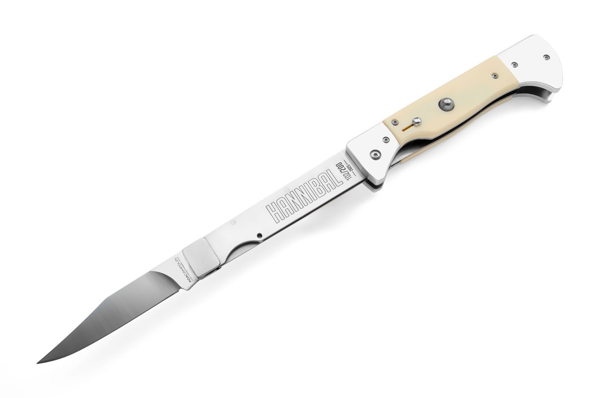 Hannibal A.G.A. Campolin: the first automatic BBQ knife! Born for lovers of automatic knives and stilettos, Hannibal is a unique collector’s item — and also perfect for those who want to impress at a barbecue. Inspired by the classic BBQ knife — with a long blade at the base to keep hands away from the heat — Hannibal redefines the concept with a push-button automatic opening and safety lock, plus a secure liner lock closing system. It’s the only knife on the market that combines both automatic and gravity-assisted opening. The blade, about two-thirds the length of the knife and finely sharpened, offers an unmatched blend of practicality and visual impact. The kick spring is a two-piece design, like the vintage switchblades. Its thick and sturdy spring measures an impressive thickness of 6mm. Be careful when closing the knife. It has a double liner lock: the first without the lock, then with the second 'fold' of the blade, the two parts of the blade lock into the handle. Watch the video carefully. The 2025 first edition is limited to just 600 individually numbered pieces, divided among three exclusive models: Snake Wood, Ebony Wood, and Imitation Ivory. Each version is numbered from 001/200 to 200/200. Every Hannibal comes with a certificate of authenticity and a box made of fine wood. An absolute must-have for every collector — or for anyone looking to turn their BBQ into a true spectacle! Overall lenght: 34.1cm – 13.4" Blade Lenght: 20 cm – 7.87" / sharp 9cm - 3.5" Blade Thickness: 0.3 cm – 0.11" Blade Material: Stainless steel Handle Material: Imitation Ivory Weight: 315 gr- 11.11 oz