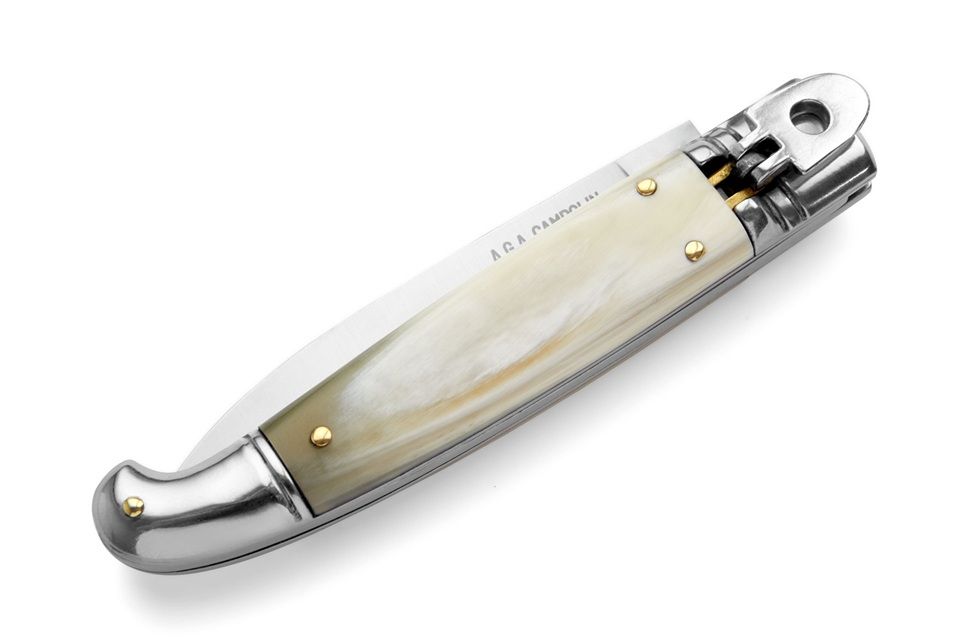 A.G.A. Campolin Old Style Brazilian Cow Horn Lever Lock Italian Automatic Knife. This 8" lever lock automatic knife from A.G.A. Campolin, Maniago (Italy) features beautiful handmade craftsmanship and style. Press the lever down and the knife opens automatically! This genuine italian automatic switchblade features a 440C Stainless steel plain blade, steel bolsters and genuine cow horn scales. A nice EDC knife or collectable switchblade. Note: as it is a natural material, colour, texture and pattern will vary from knife to knife. Overall Length: 20cm - 8" Blade Length: 8,25cm - 3,25 " Blade thickness: 2,7mm - 0.11" Weight: 115 gr Blade Material: Stainless steel 440C Handle Material: Brazilian cow horn Frame Material:steel Made in: Italy