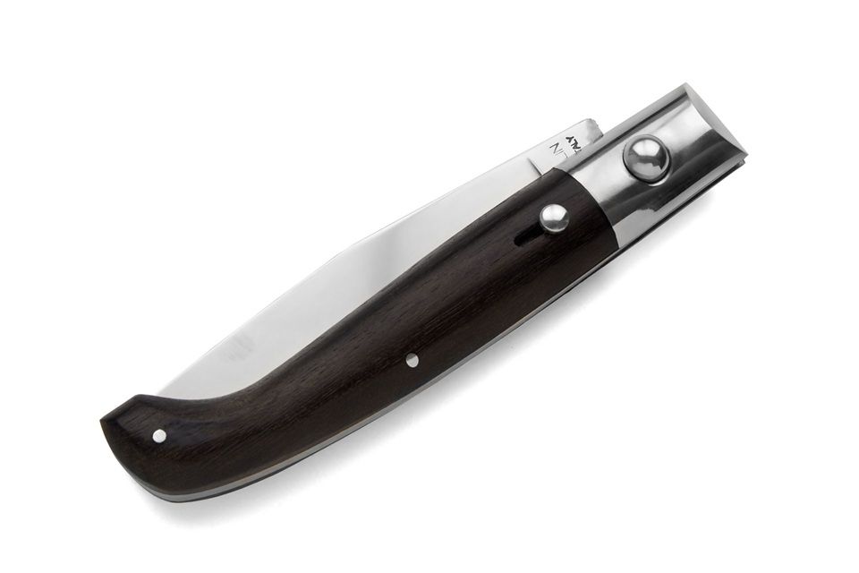A.G.A. Campolin Pattada Ebony Wood Italian Automatic Knife. We are pleased to present the first production of a classic Italian automatic knife: the "Pattada". Originally produced in the 1960s, it is now reintroduced with some embellishments by A.G.A. Campolin from Maniago. The mechanism is activated and unlocked with the button. All parts (bolster, button, safety, and rivets) are made of nickel silver. The handle, crafted from natural Brazilian Horn and finished by hand, adds a touch of class to this knife. The blade is made of N690Co steel with the logo stamped using a punch. It comes with a leather sheath and box. A genuine italian knife. As natural handles are used, colors and shades may vary compared to the photo. Overall length: 21cm - 8.27" Blade length: 8 cm - 3.15" Weight: 99gr - 3.5 oz Blade Material: Steel Handle Material: Ebony Made in: Italy