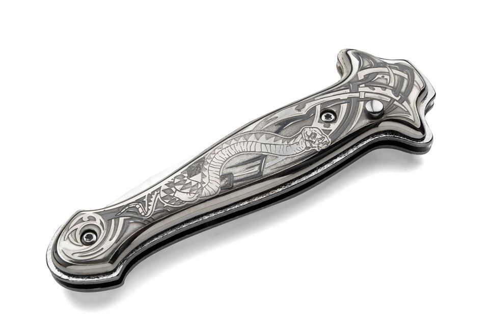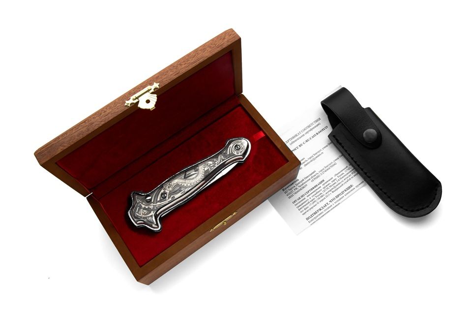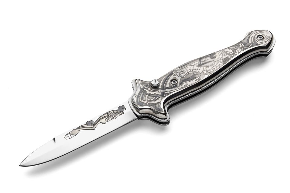 A.G.A. Campolin Silver Viper Plated Italian Stiletto Automatic Knife. This beautiful SILVER GAMBLER is a great collaboration between AGA Campolin who made the design and knifemaker Dmitry Chertov from Zlatoust, Russia. The blade on this coil spring automatic switchblade is made of 40Х10С2М steel and the handle is silver plated with handpainted design. It comes in an elegant luxury wood box with velvet inlay, leather sheath and certificate.This is a limited production of 25 pieces. Amazing knife for your collection. Overall Length: 22cm - 8.6" Blade length: 9cm - 3.5" Blade thickness: 2.5mm - 0.1" Weight: 220g - 7.9 oz. Blade Material: 40Х10С2М Stainless Steel Hardness: HRC 60 Handle Material: Silver Plated Made in: Russia