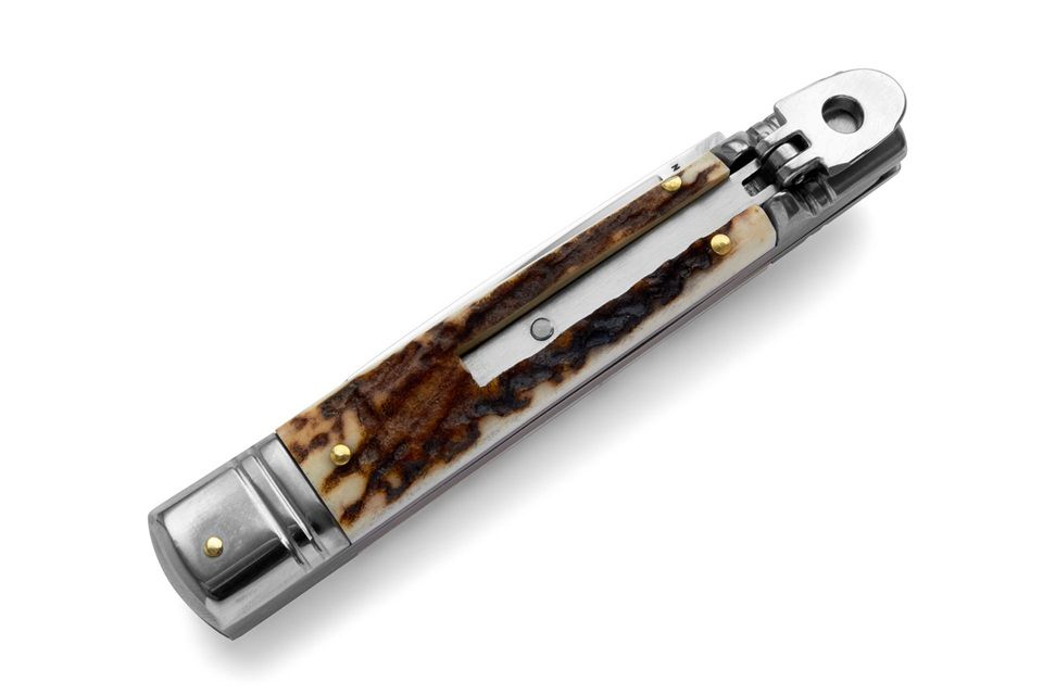 A.G.A. Campolin Stag Leverlock Automatic Knife. This is the slim version of the A.G.A. Campolin Italy italian slim 8” leverlock knife. This side opening automatic switchblade has a 440A stainless steel blade and stainless steel bolsters. The handle is made of stag horn. Note: as it is a natural material, colour, texture and pattern will vary from knife to knife. Overall Length: 20cm - 7.8" Blade Length: 8,2cm - 3.2" Blade thickness: 3mm - 0.11" Weight: 95gr - 3.3oz Blade Material: 440A Stainless Steel Handle Material: Stag Horn Made in: Italy