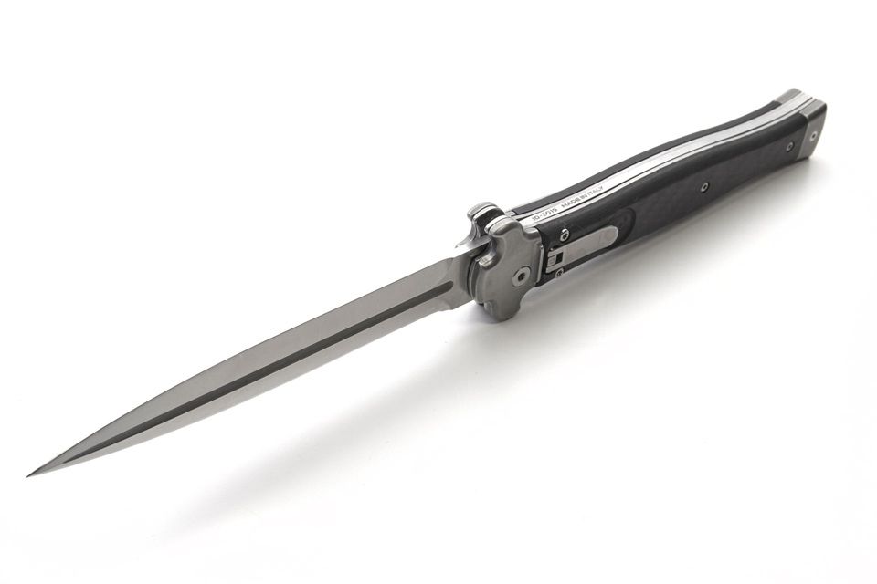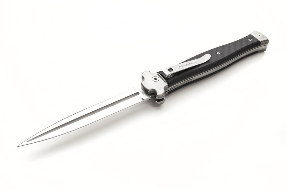 ZERO+ is a modern stiletto with leverlock mechanism and is the longest leverlock available!! It has a M390 stainless steel dagger blade with satin finish and a solid AISI 430 steel glass blasted bolster. The double spring gives faster action and guarantees longer durability. The inverted lever gives a quick opening action. The handle is made of carbon fiber. The stainless steel pocket clip can be easily removed and replaced with a steel shield. ZERO+ is covered by 1 year warranty from the original end user's purchasing date. Overall length: 26cm - 10.25" Blade length: 12cm - 4.7" Blade thickness: 3.5mm - 0.14" Weight: 215g - 7.6oz Blade material: N690Co Stainless Steel Handle material: Carbon Fiber Made in: Italy