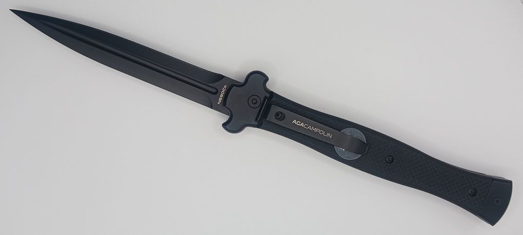 A.G.A. Campolin Zero + Leverlock Automatic Knife Black G-10 (4.7" Black Dagger). ZERO+ is a modern stiletto with leverlock mechanism and is the longest leverlock available!! It has a N690Co Stainless Steel bayonet blade with black idroglider coating and a solid AISI 430 steel black coated bolsters. The double spring gives faster action and guarantees longer durability. The inverted lever gives a quick opening action. The black G10 handle has a 3d texture for a better grip. The stainless steel pocket clip can be easily removed and replaced with a steel shield. Overall length: 26cm - 10.25" Blade length: 12cm - 4.7" Blade thickness: 3.5mm - 0.14" Weight: 215g - 7.6oz Blade material: N690Co Stainless Steel Handle material: G10 Made in: Italy
