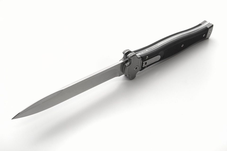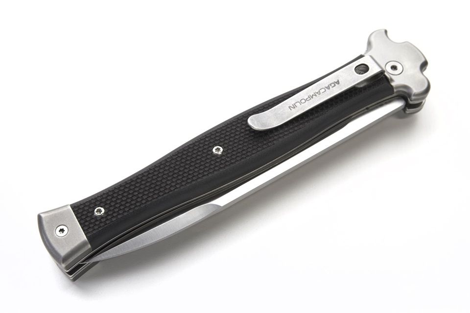 A.G.A. Campolin Zero Plus G10 Black Leverlock Automatic Knife. ZERO+ is a modern stiletto with leverlock mechanism and is the longest leverlock available!! It has a N690Co stainless steel bayonet blade with satin finish and a solid AISI 430 steel glass blasted bolster. The double spring gives faster action and guarantees longer durability. The inverted lever gives a quick opening action. The black G10 handle has a 3d texture for a better grip. The stainless steel pocket clip can be easily removed and replaced with a steel shield. ZERO+ is covered by 1 year warranty from the original end user's purchasing date. Overall length: 26cm - 10.25" Blade length: 12cm - 4.7" Blade thickness: 3.5mm - 0.14" Weight: 215g - 7.6oz Blade material: N690Co Stainless Steel Handle material: G10 Made in: Italy