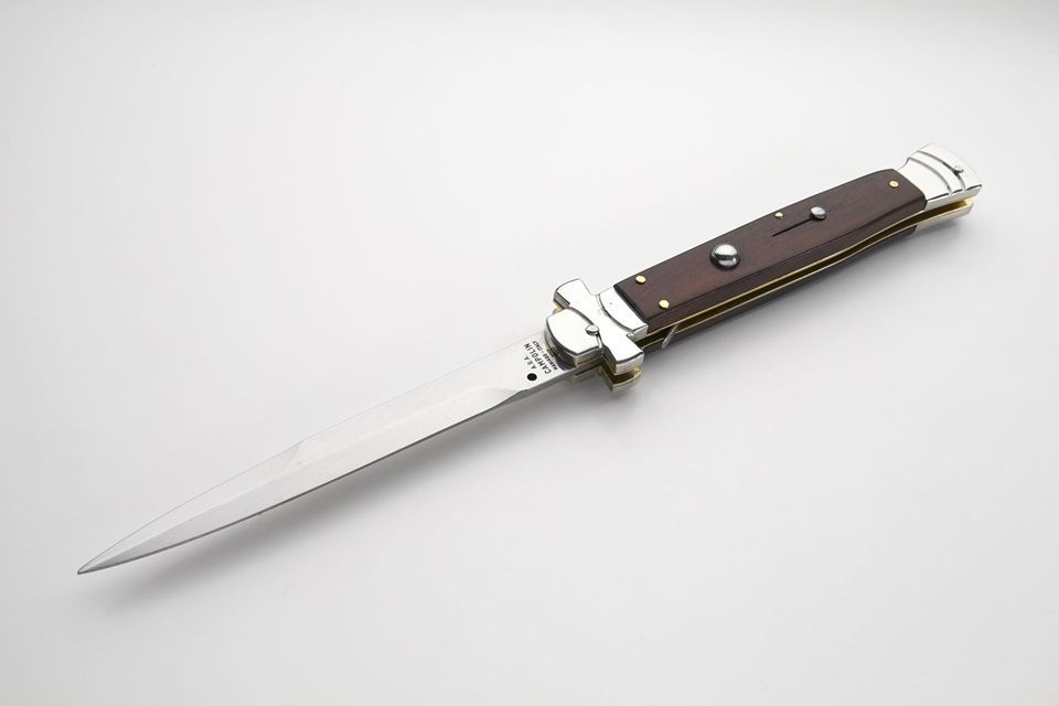 AGA Campolin 11" Maltese Cross Stiletto Automatic Santos Wood 5" Bayonet. This A.G.A. Campolin Maltese is a beautiful quality automatic stiletto. It features a 440A stainless steel bayonet blade with mirror polished finish. The solid nickel silver bolsters remind of the maltese cross and it has a lock back release mechanism. The handle is made of santos wood and the liners of brass. A beautiful piece to add to your collection. Note: as it is a natural material, color, texture and pattern will vary from knife to knife. Overall Length: 28cm - 11" Blade Length: 12,5cm - 5" Blade thickness: 3,5mm - 0.14" Weight: 220gr - 7.7oz Blade Material: 440A Stainless Steel Handle Material: Santos Wood Frame Material: Brass Made in: Italy