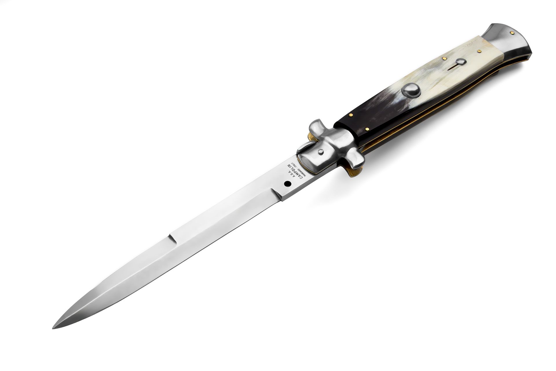 AGA Campolin 15 Inch Italian Stiletto Automatic Knife Brazilian Horn Bayo. Overall Length: 38cm - 15" Blade Length: 18cm - 7" Blade thickness: 5.0mm - 0.2" Weight: 390 gr. Blade Material: Stainless steel AISI 420 Handle Material: Brazilian cow horn Frame Material: Brass Made in: Italy