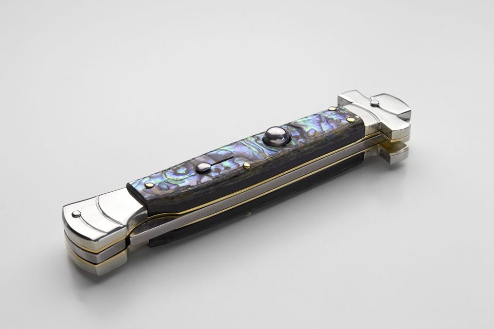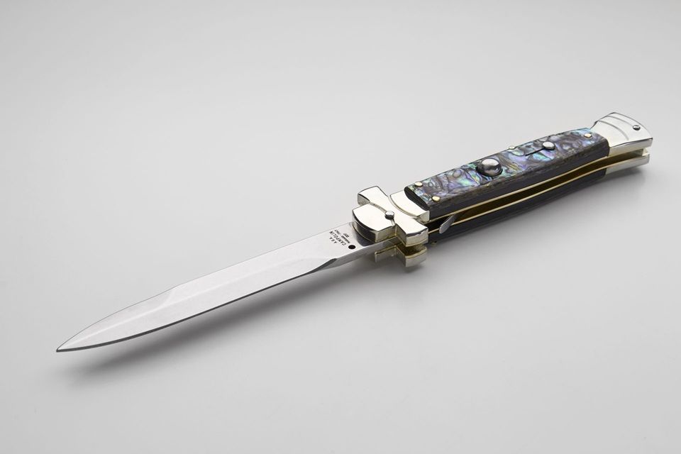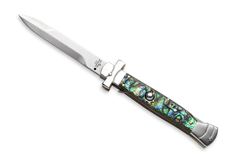 AGA Campolin 9 Inch Maltese Cross Abalone Stiletto Automatic Knife Bayo. Overall Length: 23cm - 9" Blade Length: 10cm - 4" Blade thickness: 3,5mm - 0.14" Weight: 175 gr. Blade Material: AISI 420 Stainless steel Handle Material: Abalone Frame Material: Brass Made in: Italy