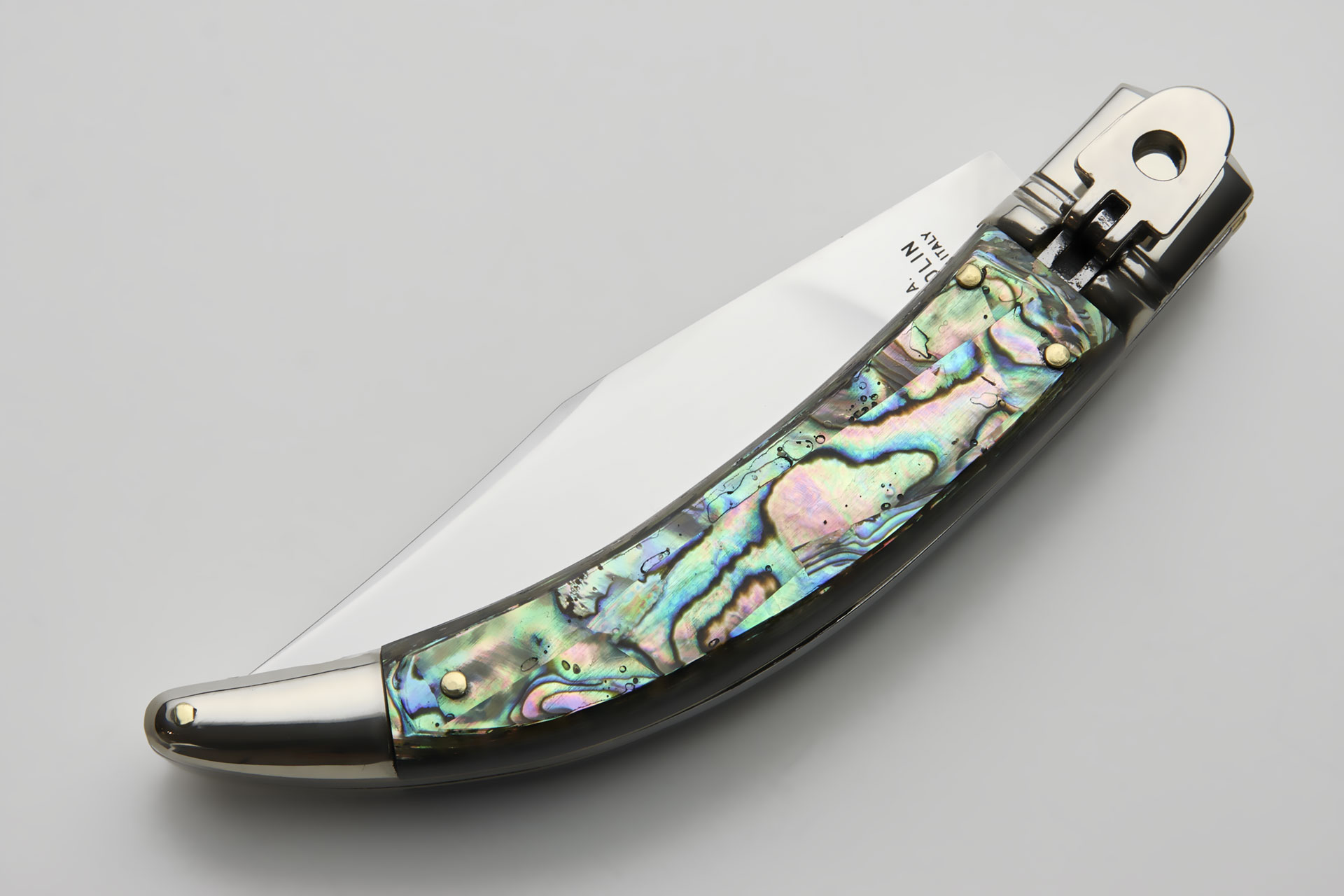 AGA Campolin Diana Abalone Italian Leverlock Automatic Knife. Overall Length: 21,5 cm - 8.5" Blade Length: 10cm - 4" Blade thickness: 3,5mm - 0.14" Weight: 140 gr. Blade Material: Stainless steel 440C Handle Material: Abalone Frame Material: Brass Made in: Italy