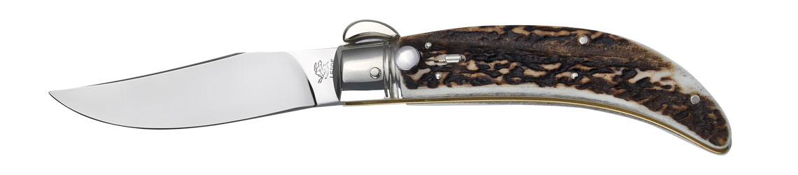 AGA Campolin Lepre Stag Horn Automatic Knife with filework down the spine and blade. Lepre 2015 is a catalana style knife with a few new twists. The firing mechanism is a new plunge button style that activates a sturdy spring and sear pin on the back side of the knife so it will be noticed that the hole in the blade is on the back side. The safety is a short section of nickel silver rod that is set in relief in a milled slot of the handle material. Overall Length: 21cm / 8.5" Blade Length: 9cm / 3.5" Blade thickness: 3,5mm - 0.15" Weight: 145 gr. Blade Material: Stainless steel W1.4116+N Frame Material: Brass