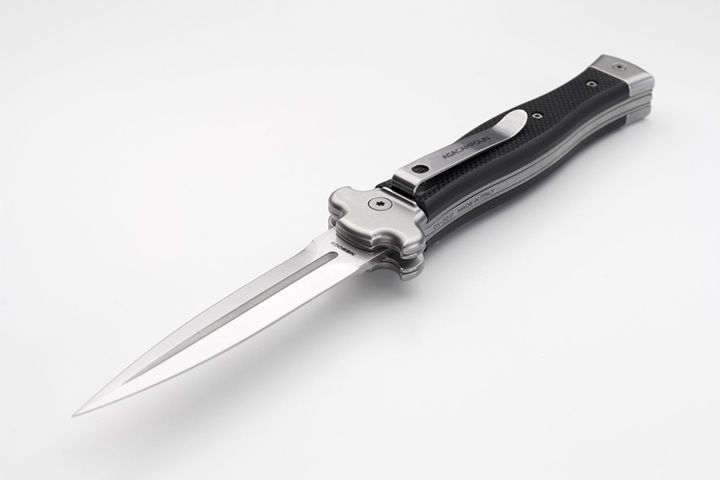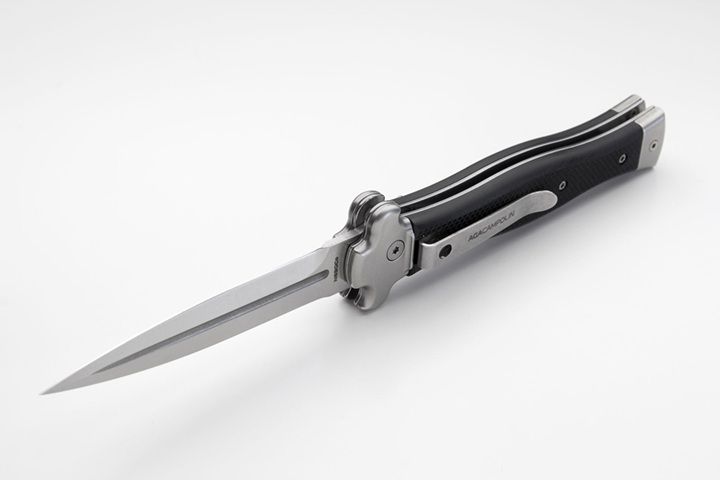AGA Campolin Zero Black G-10 Automatic Leverlock Knife Satin Dagger. Overall length: 23 cm - 9" Blade length: 10 cm - 3.94" Blade thickness: 3.5 mm - 0.14" Weight: 170g - 5.99oz Blade material: N690Co stainless steel Handle material: G-10 Black Made in: Italy