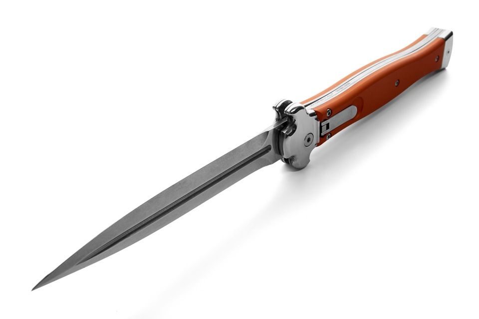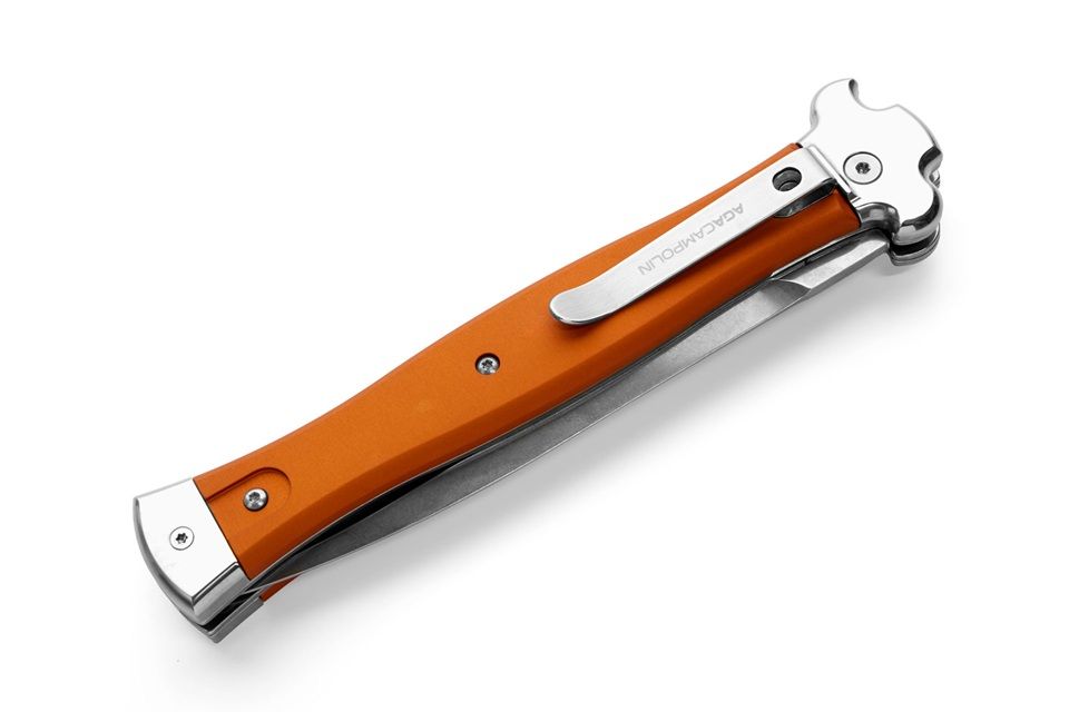 AGA Campolin Zero + Orange Aluminum Leverlock Automatic Knife Dagger Polished Plain. ZERO+ is a modern stiletto with leverlock mechanism and is the longest leverlock available!! It has a stainless steel N690Co Daga blade with polished mirror finish and a solid AISI 430 steel glass blasted bolster. The double spring gives faster action and guarantees longer durability. The inverted lever gives a quick opening action. The Turquoise Aluminium handle has a 3d texture for a better grip. The stainless steel pocket clip can be easily removed and replaced with a steel shield. ZERO+ is covered by 1 year warranty from the original end user's purchasing date. Overall length: 26cm - 10.25" Blade length: 12cm - 4.7" Blade thickness: 3.5mm - 0.14" Weight: 215g - 7.6oz Blade material: N690Co Stainless Steel Handle material: Aluminium Made in: Italy