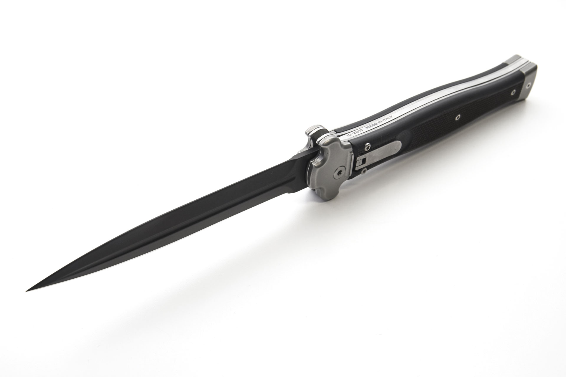 AGA Campolin Zero Plus G-10 Leverlock Automatic Knife Black Dagger. Overall length: 26cm - 10.25" Blade length: 12cm - 4.7" Blade thickness: 3.5mm - 0.14" Weight: 215g - 7.6oz Blade material: M390 Stainless Steel Handle material: G10 Made in: Italy