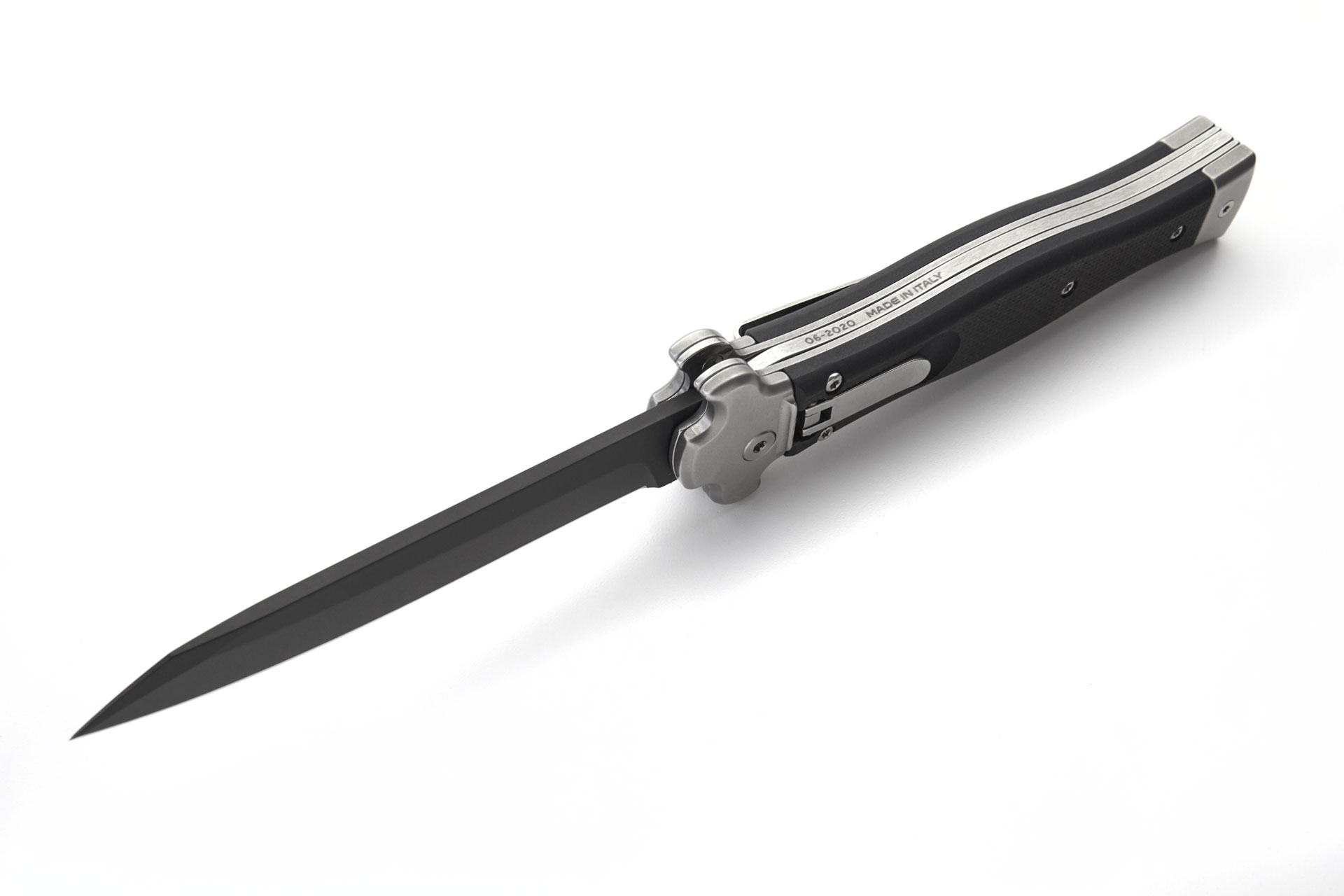 AGA Campolin Zero Plus G-10 Leverlock Automatic Knife Black Dagger. ZERO is a modern stiletto with leverlock mechanism. It has a N690Co stainless steel tanto blade with black PVD coated finish and solid steel AISI 430 glass bead blasted bolster. Double spring gives faster action and guarantees longer durability. Inverted lever for a quick opening action. The black G-10 handle with a 3d texture ensures better grip. The stainless steel pocket clip can be easily removed and substitute with a little steel shield. Overall length: 22cm - 8,7" Blade length: 10cm - 4" Blade thickness: 3.5mm - 0.14" Weight: 170g - 6oz Blade material: N690Co Stainless Steel Handle material: G-10 Made in: Italy