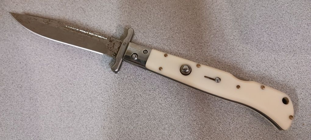 ROMA is a new swinguard from AKC World is a new line of italian knives designed in Italy. These are excellent quality knives with Italian style. Very nice shape and good mechanism. Nice for any collection but also as fancy pocket knife. Price quality range is very good. Overall lenght: 28cm – 10,90" Blade Lenght: 11,7cm – 4,60" Blade Thickness: 0,3cm – 0,11" Weight: 195gr - 7oz Blade Material: AISI 420 stainless steel Damascus Handle Material: Imitation Ivory Frame material: AISI 420 stainless steel Made in: China