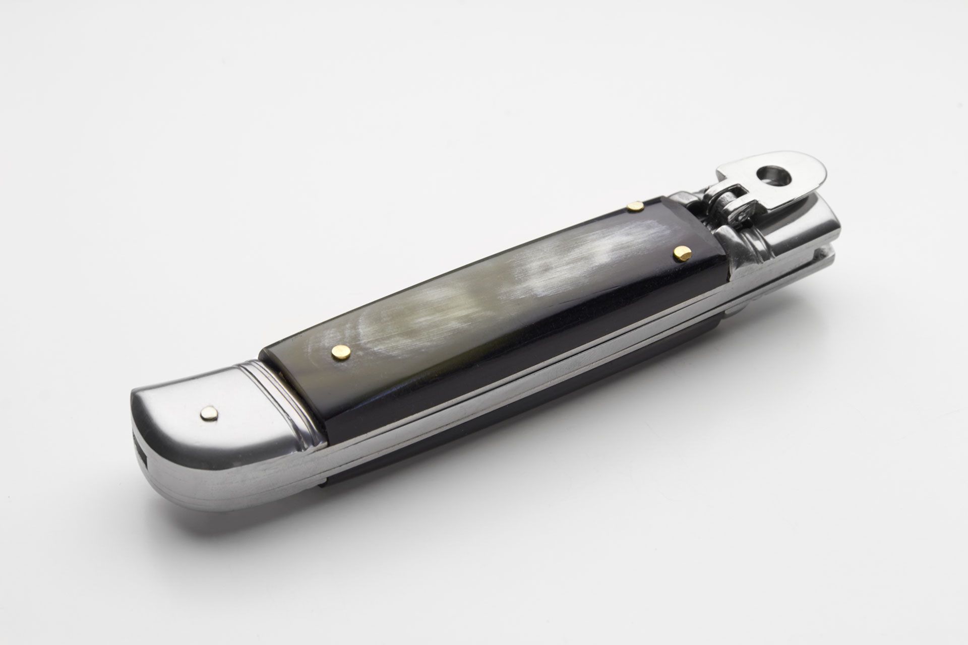 AKC Brazilian Horn Leverlock Side Opening Automatic Knife.AKC Italy makes this classic 8” leverlock knife. Drop-point blade and very beautiful all around. Stainless steel bolsters and Brazilian cow horn scales on this one. Overall Length: 20cm - 7.8" Drop-point blade length: 8,2cm - 3.25" Blade thickness: 2,7mm - 0.11" Weight: 120 gr Blade Material: Stainless steel Handle Material: brazilian cow horn Frame Material: Brass Made in: Italy
