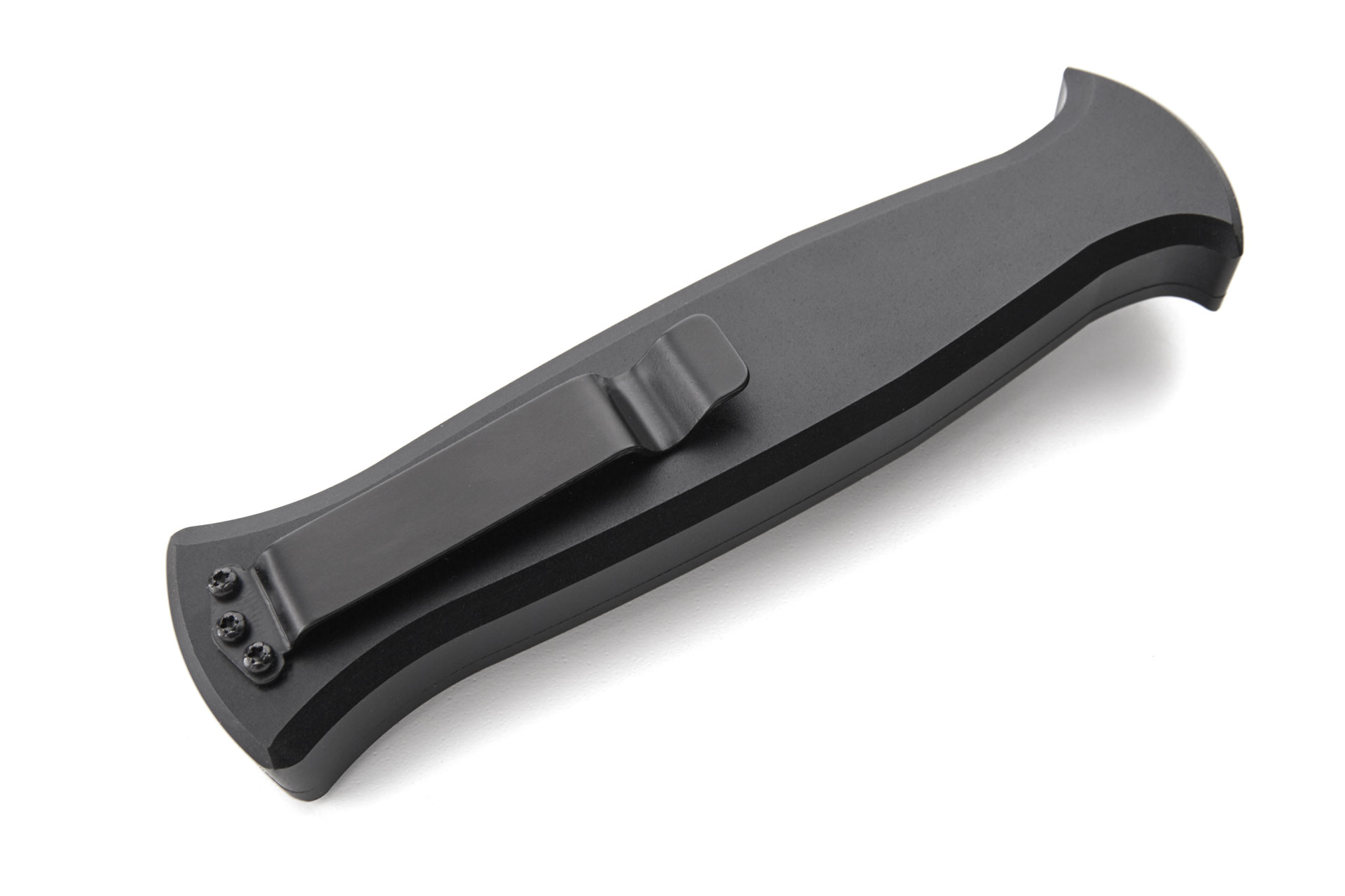 The AKC X-TREME made with modern materials and an aggressive italian design increased the standard of their OTF production. This new automatic model "EVO", short for EVOLUTION, is the modern version of an old OTF Angelo Campolin Sr. made in the 70's for the Solingen/Germany company Otello. The ergonomic black handle and orange button are made using solid CNC worked 6061-T6 aircraft aluminium. The plain grind blade on this switchblade is made of AUS-8 japanese steel with a HRC of 58-59 and has a PVD coated finish. It includes a black pocket clip. This OTF fires fast and has minimum bladeplay. Overall Length: 21.5 cm - 8.46" Blade Length: 9cm - 3.54" Blade Thickness: 3mm - 0.12" Weight: 120gr - 4.2ozBlade Material: AUS-8 Japanese Steel Handle Material: Aluminium Made in: Taiwan