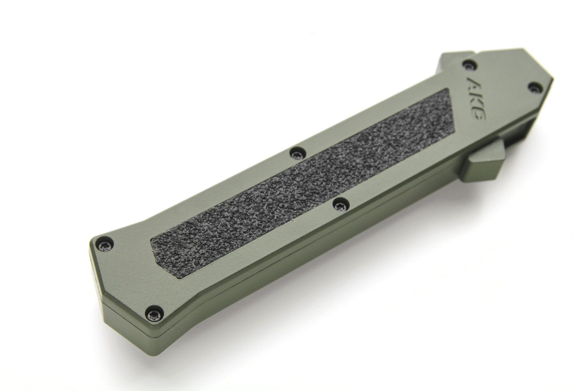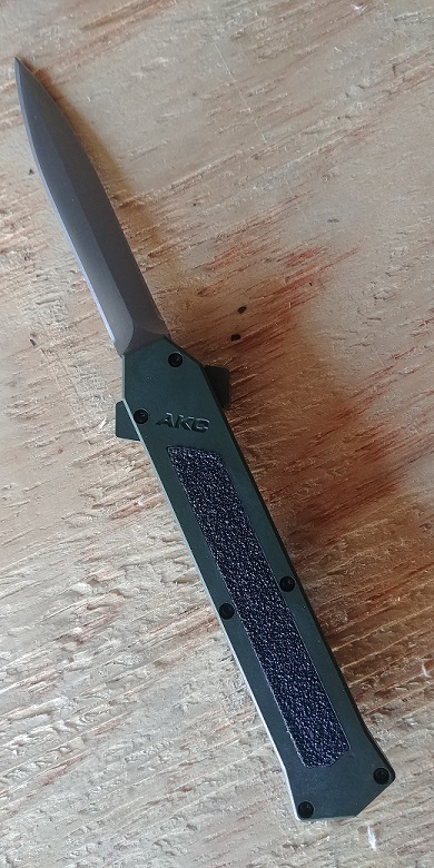 AKC F-16 Army Green Grip OTF Automatic Knife Satin Dagger. Overall Length: 20cm - 8" Blade Length: 8.5cm - 3.35" Blade thickness: 3mm - 0.12" Weight: 88 g - 3.10 oz. Blade Material: 440A Stainless steel Handle Material: Aluminium Orange Inlay Material: Grip black