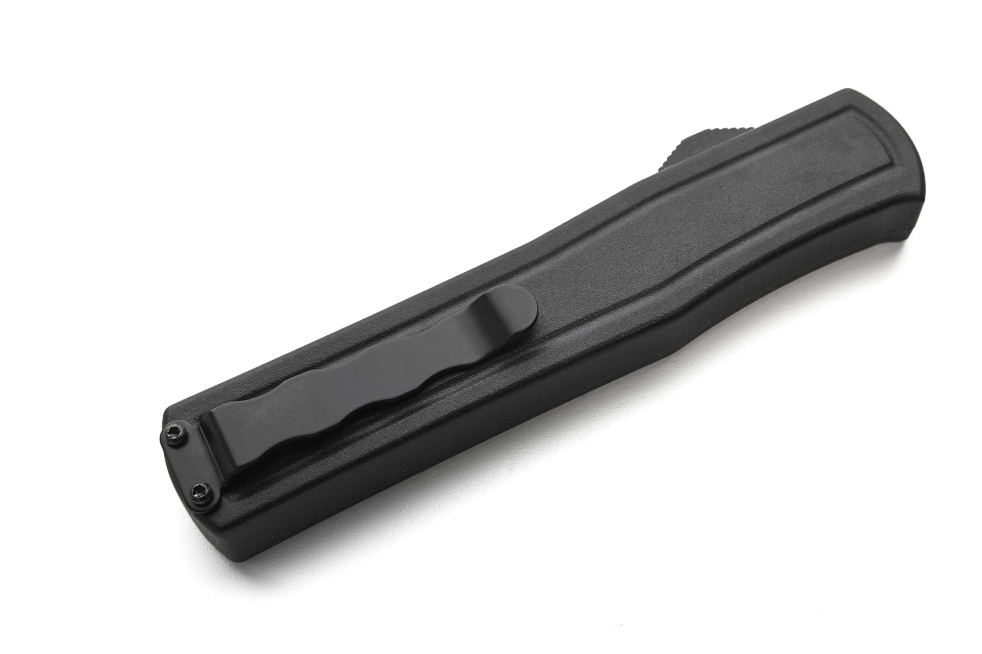 This new great ergonomic OTF from AKC Italy F20 is excellent quality. It is 0.5" (1.3cm) longer than it's smaller brother the F16. The ergonomic handle on this automatic switchblade is made of aluminum with black sandpaper insert for a safe grip. The razor sharp particular 440A steel drop point blade has a very nice grind and comes in satin finish. It has a strong solid mechanism with almost zero blade play. The price quality is the best you can find. You will not be disappointed with it! Overall Length: 21.3cm - 8.4" Blade Length: 9.3cm - 3.6" Weight: 105g - 3.7ozBlade Material: 440A Stainless Steel Handle Material: Aluminum Inlay Material: Sandpaper