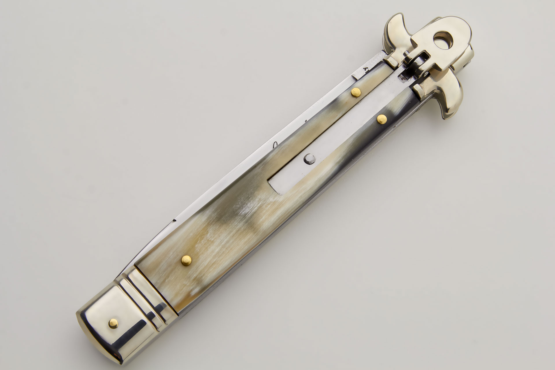 AKC Leverletto 9" Brazilian Horn Lever Lock Automatic Knife. designed by Bill DeShivs for AKC in 2007. It's a side opening automatic switchblade knife. Nickel silver bolsters, Brazilian horn scales. as it is a natural material, colour, texture and pattern will vary from knife to knife. Overall Length: 23cm - 9" Blade Length: 10cm - 3.9" Blade thickness: 2,7mm - 0.11" Weight: 115 grBlade Material: Stainless steel 440 A Handle Material: Brazilian horn Frame Material: Brass Made in: Italy