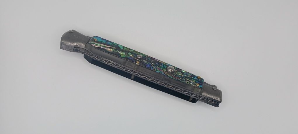 AKC World 11" Abalone File Work Damascus Italian Swinguard Automatic Knife. We present a classic Italian-style knife: the 28 cm Swinguard. Elegant, featuring a fast automatic opening mechanism and rock-solid lock-up when deployed, this knife represents an excellent purchase — especially considering its outstanding quality-to-price ratio. The handle is crafted from Abalone, while the blade and liners are made of Damascus steel. A special detail that adds a real touch of class is the beautifully executed file work on the spring. Overall length: 28cm – 10,90" Blade Length: 11,4cm – 4,60" Blade Thickness: 0,3cm – 0,11" Weight: 168gr - 5.92oz Blade Material: Damascus Handle Material: Abalone Frame material: Damascus