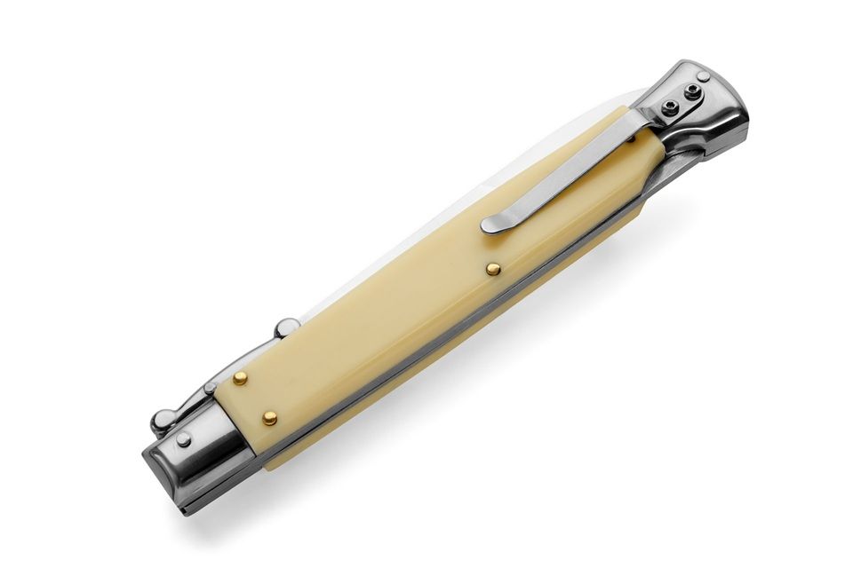 AKC World 11" Imitation Ivory Italian Swinguard Automatic Knife. We present a classic Italian-style knife: the 28 cm Swinguard. Elegant, featuring a fast automatic opening mechanism and rock-solid lock-up when deployed, this knife represents an excellent purchase — especially considering its outstanding quality-to-price ratio. The handle is crafted from Imitation Ivory, while the blade and liners are made of stainless steel. Overall length: 28cm – 10,90" Blade Length: 11,4cm – 4,60" Blade Thickness: 0,3cm – 0,11" Weight: 171gr - 6oz Blade Material: Stainless steel Handle Material: Imitation Ivory Frame material: Stainless steel