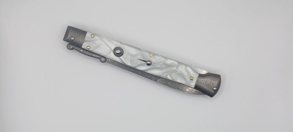 AKC World 11" Imitation Pearl Damascus Italian Swinguard Automatic Knife. We present a classic Italian-style knife: the 28 cm Swinguard. Elegant, featuring a fast automatic opening mechanism and rock-solid lock-up when deployed, this knife represents an excellent purchase — especially considering its outstanding quality-to-price ratio. The handle is crafted from Imitation Pearl, while the blade and liners are made of Damascus Steel. Overall length: 28cm – 10,90" Blade Length: 11,4cm – 4,60" Blade Thickness: 0,3cm – 0,11" Weight: 172gr - 6.1oz Blade Material: Stainless steel Handle Material: Imitation Pearl Frame material: Damascus Steel
