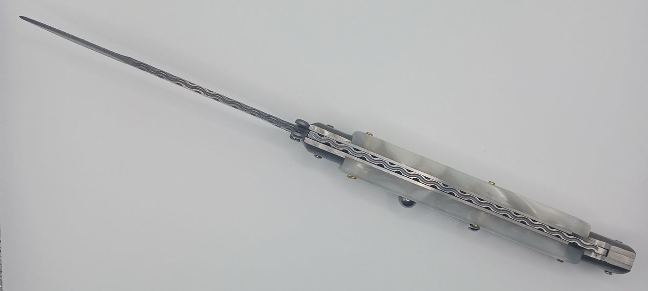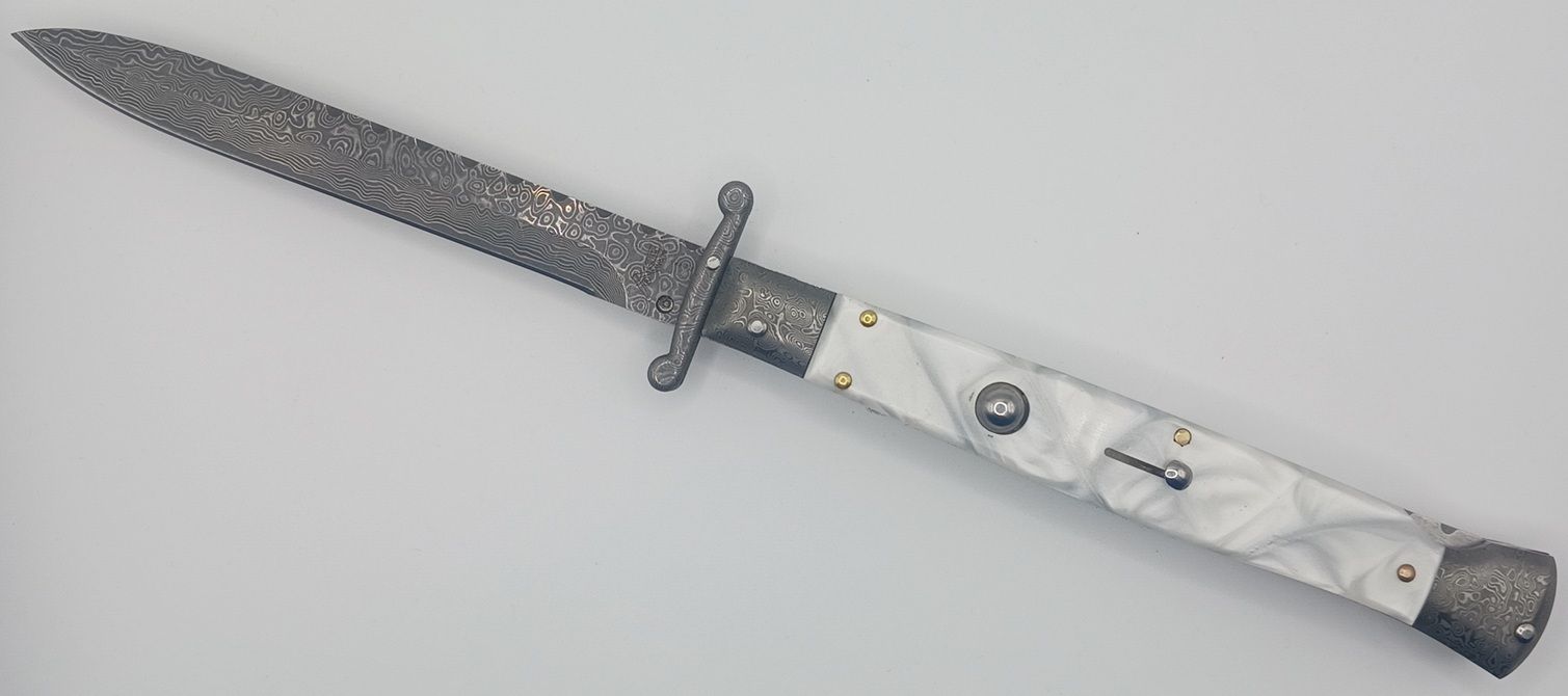 AKC World 11" Imitation Pearl File Work Damascus Italian Swinguard Automatic Knife. We present a classic Italian-style knife: the 28 cm Swinguard. Elegant, featuring a fast automatic opening mechanism and rock-solid lock-up when deployed, this knife represents an excellent purchase — especially considering its outstanding quality-to-price ratio. The handle is crafted from Imitation Pearl, while the blade and liners are made of Damascus Steel. A special detail that adds a real touch of class is the beautifully executed file work on the spring. Overall length: 28cm – 10,90" Blade Length: 11,4cm – 4,60" Blade Thickness: 0,3cm – 0,11" Weight: 172gr - 6.1oz Blade Material: Stainless steel Handle Material: Imitation Pearl Frame material: Damascus Steel