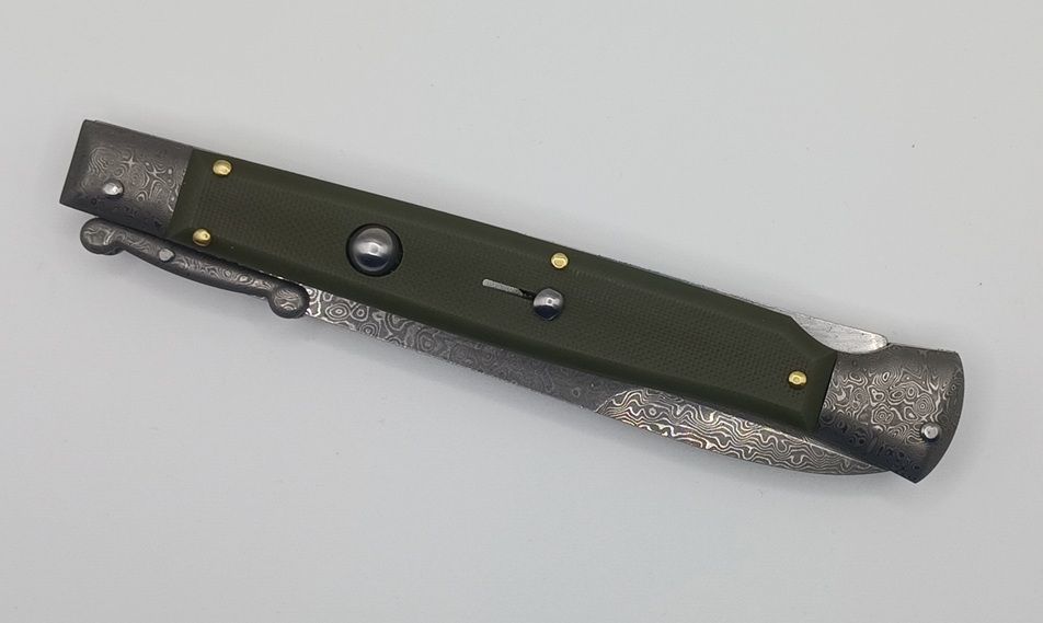 AKC World 11" OD Green G10 Damascus Italian Swinguard Automatic Knife. We present a classic Italian-style knife: the 28 cm Swinguard. Elegant, featuring a fast automatic opening mechanism and rock-solid lock-up when deployed, this knife represents an excellent purchase — especially considering its outstanding quality-to-price ratio. The handle is crafted from OD Green G10, while the blade and liners are made of stainless steel. Overall length: 28cm – 10,90" Blade Length: 11,4cm – 4,60" Blade Thickness: 0,3cm – 0,11" Weight: 172gr - 6.1oz Blade Material: Damascus Handle Material: OD Green G10 Frame material: Damascus