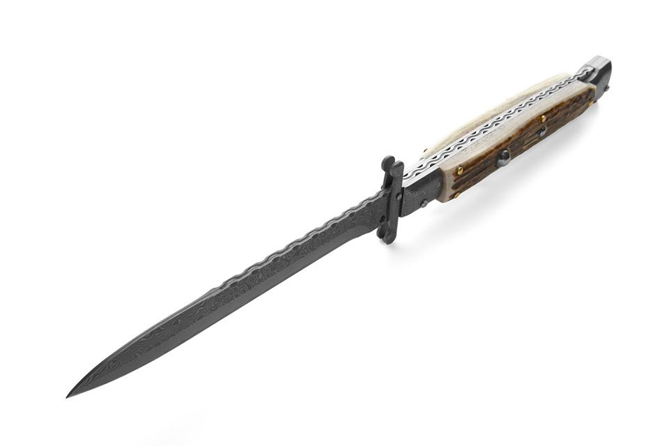 AKC World 11" Stag Horn File Work Damascus Italian Swinguard Automatic Knife. We present a classic Italian-style knife: the 28 cm Swinguard. Elegant, featuring a fast automatic opening mechanism and rock-solid lock-up when deployed, this knife represents an excellent purchase — especially considering its outstanding quality-to-price ratio. The handle is crafted from stag horn, while the blade and liners are made of Damascus steel. A special detail that adds a real touch of class is the beautifully executed file work on the spring. Overall length: 28cm – 10,90" Blade Length: 11,4cm – 4,60" Blade Thickness: 0,3cm – 0,11" Weight: 176gr - 6.21oz Blade Material: Damascus Handle Material: Stag Horn Frame material: Damascus