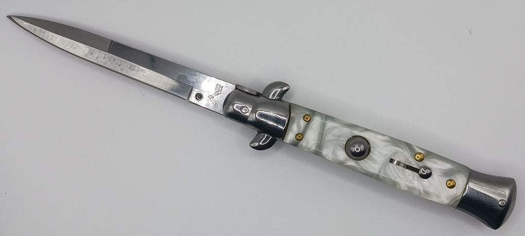 AKC World 9" White Pearl Italian Stiletto Automatic Knife Bayonet Satin. Overall length: 23cm – 9" Blade Length: 10,50 cm – 4,125" Blade Thickness: 3,5mm – 0,34" Weight: 108 gr Blade Material: Stainless steel Handle Material: Acrylic Frame material: stainless steel. Comes with a card of authenticity and a belt sheath.